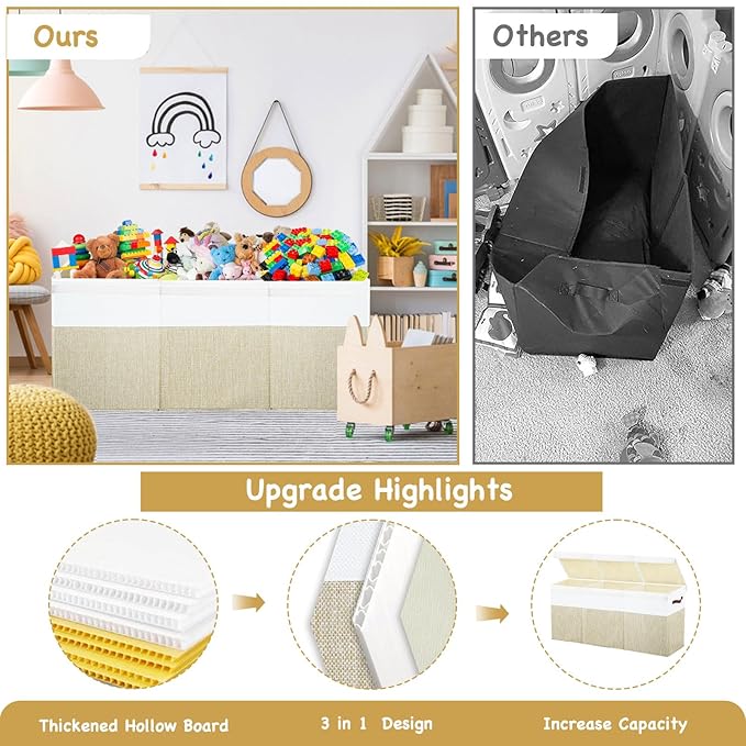 - Elegant Design-Our toy box features a two-tone stitching design and faux leather handles on both sides secured with metal rivets, creating a light luxury and elegance effect for your home. Three Velcro-fastened lids ensure easy access while also allowing you to stack other lighter items on top.