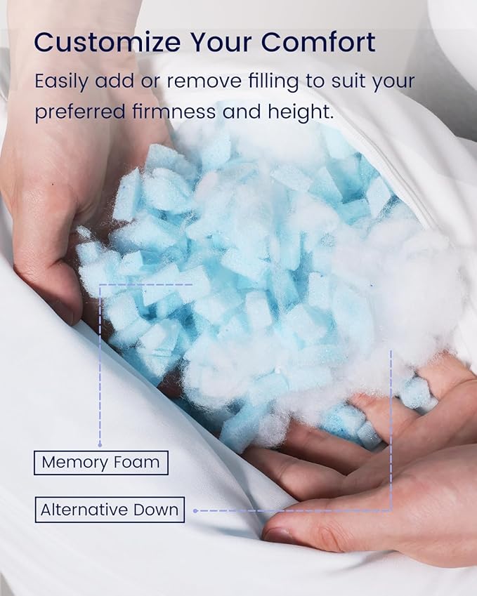 - CUSTOMIZABLE COMFORT WITH ADJUSTABLE FILLING: Experience personalized luxury with our innovative adjustable filling feature. No more compromises – our invisible zipper design allows you to effortlessly tailor the firmness of your pillow by adding or removing premium shredded memory foam filling. Say goodbye to pillows that are too high, too low, too soft, or too firm, and embrace the perfect balance of comfort