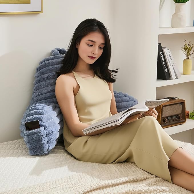 Faux Fur Fluffy Dusty Blue Reading Pillow with Pockets, Luxury Striped Plush Decorative, Arm Rests and Back Surport for Bed Rest, Lounging on sofa, Large