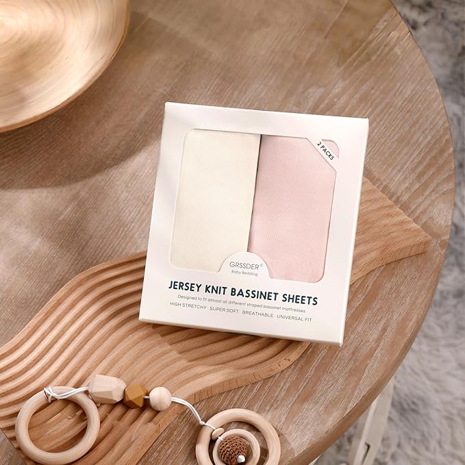 GRSSDER Stretchy Ultra Soft Fitted Bassinet Sheet 2 Pack, Universal Fit for Bassinets Baby Cradle Moses Basket Oval Rectangle Mattress Safe and Snug, Jersey Bassinet Sheets for Girls, Cream/Pink