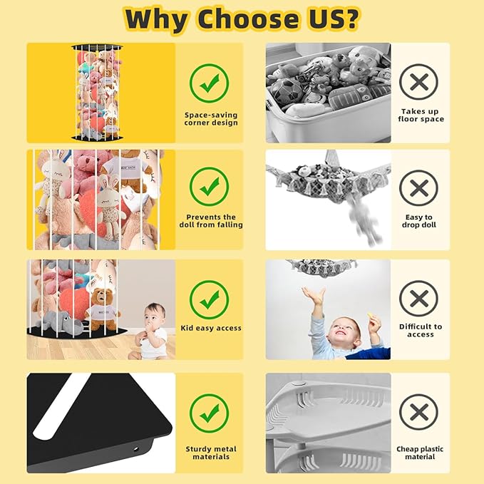 - Keeps toys organized: By hanging stuffed animals in a corner storage unit, you can keep them neatly organized and easily accessible for playtime. Due to use on wall corner, this toy storage stuffed animal holder will not take up extra floor space. Keep the stuffed animals, baby toys, jumbo toys, stuffed pet toys, and stuffed animals off the floor, and reclaim your space today. Premium stuffed animal storage is made of metal, with strong bearing capacity and durability. Patent Pending.