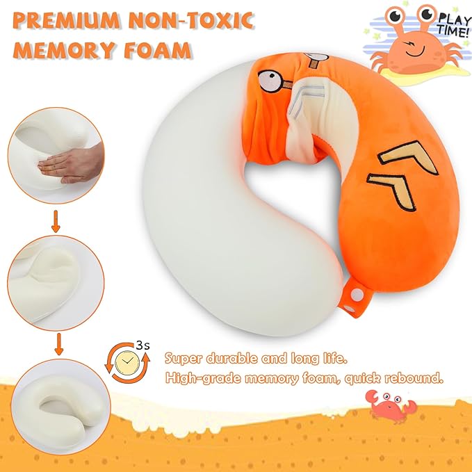 Travel Pillow, Kids Travel Pillow with Sleep Eye Mask, Soft Memory Foam Kids Neck Pillow for Boys & Girls, Travel Accessories for Car Airplane Traveling - Funny Crab