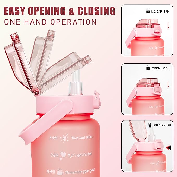 - [Leak-proof & easy to drink]: Half gallon water jug for drinking has a food-grade silicone seal, a safety lock and a dust proof cap. Just press the lock button, the lid pops open and the straw automatically rises. The workout water bottle gallon cap combines leak-proof, convenience and hygiene in one. The water gallon jug also has a removable straw for easy cleaning. Remove the straw to become a spout cap, making this black water bottle ideal for sharing drinks.