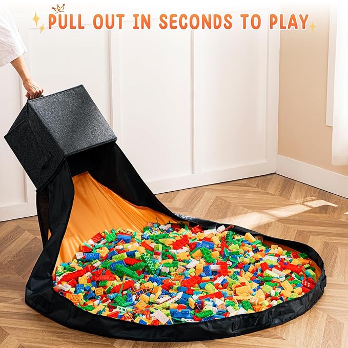 - Quick Storage: The 55" diameter play mat provides a dedicated area for creative play.Which is big enough for 2 or 3 kids to playing at the same time. When it's time to tidy up, simply fold the play mat and put all the toys back into the box. It's perfect for storage or for taking along on family trips! With a 10-gallon capacity, it can hold most toys. Say goodbye to clutter and enjoy ample space for all your blocks, building bricks, cars, and action figure collections