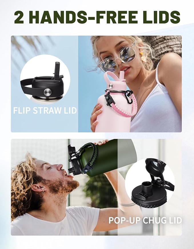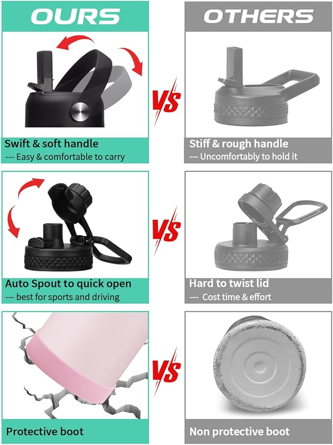 - 2 LID OPTIONS (Auto-spout & Straw): two different lids are complete LEAK PROOF & design for easy drink. The pops-up lid for easy drinking and seals shut for no leaks when you're on the go. The straw lid makes it easy to enjoy spill-proof sips, and package come with a alternative straw & a straw brush for easy cleaning