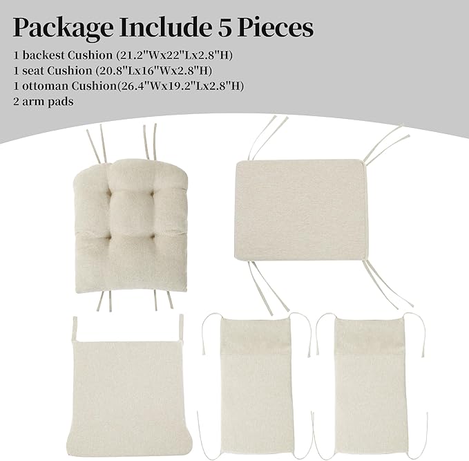 - 【Package Include】(NO Gliding Chair Included) Include 5 pieces. 1 backrest cushion (26.4*19.2 inches). 1 seat cushion (22"W*21.2"L*2.8"H). 1 ottoman cushion (20.8"W*16"L*2.8"H). 2 armrest cushions (13.2"L)