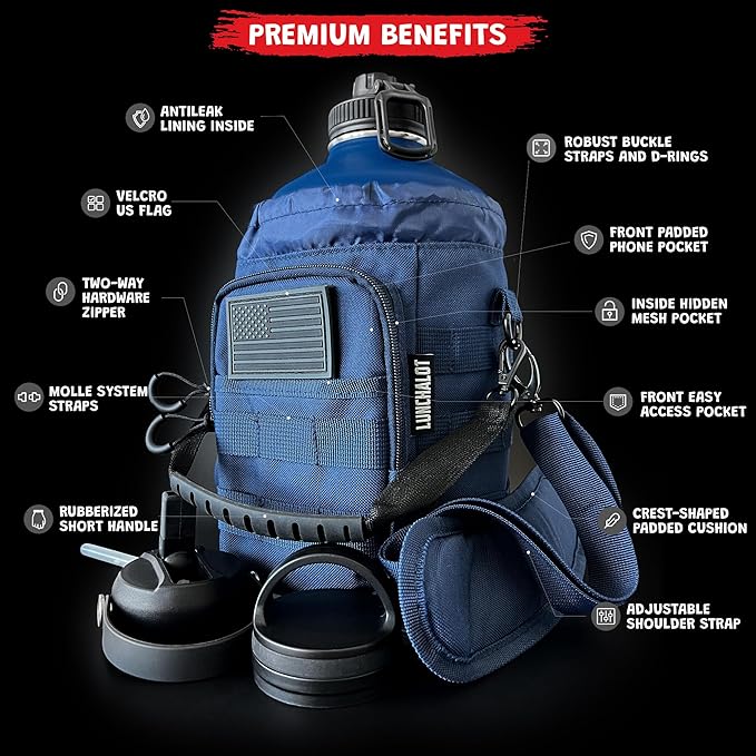 1 Gallon Water Bottle Insulated - 84 Oz Stainless Steel Metal Water Jug with Holder - | Carrying Bag | Spout Handle | Straw Lids | Keep Cold & Hot | - Navy Blue Tactical Flask