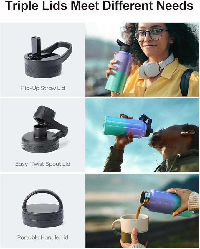 - 3 Caps Pack, 100% Leak-Proof: BUZIO stainless steel water bottle comes with 3 lids: portable handle lid, easy-twist spout lid, and flip-up straw lid to meet camping, hiking, cycling, fitness sports and more. Each lid has a thickened 360° seal for 100% leak-proof.