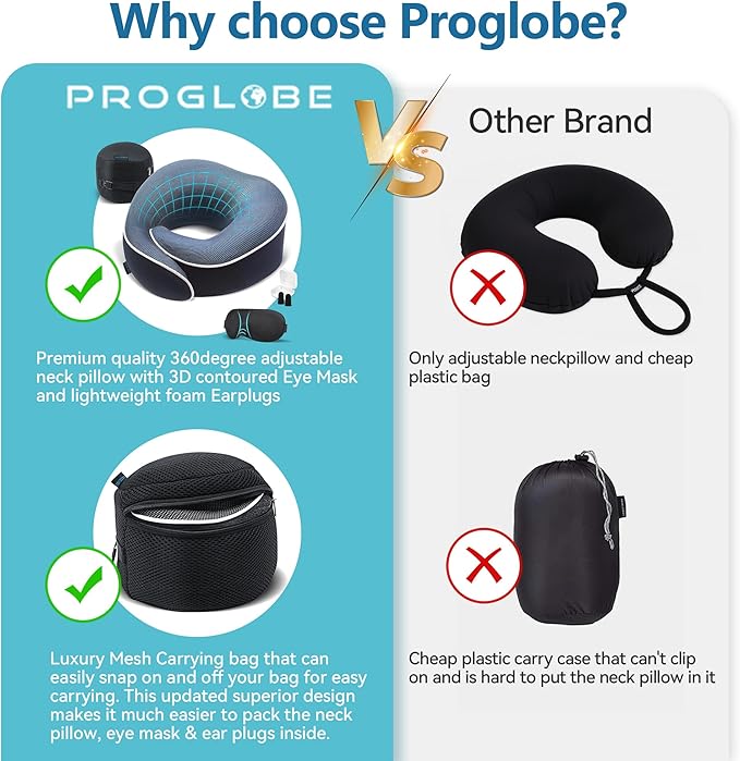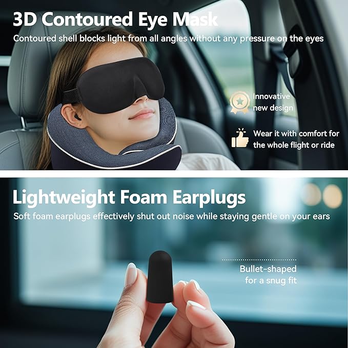 - SPECIAL EXTRA ACCESSORIES - including a high-end mesh carry bag for your neck pillow, memory foam contoured sleeping eye mask and comfortable ear plugs to block out light and sound. This optimal kit makes you ready for international travel in comfort with maximum convenience.