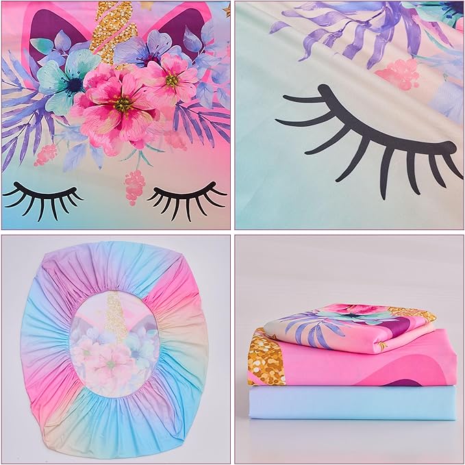 - 🦄【Design】Twin Bed Kids Sheet Set combine unicorn and flowers in rainbow background , create a warm and dreamy bedroom and bring more color and fun to life. Essential 3D unicorn toddler sets for bedroom decorations, you will find your kid getting a restful sleep on 3D toddler comforter sets.