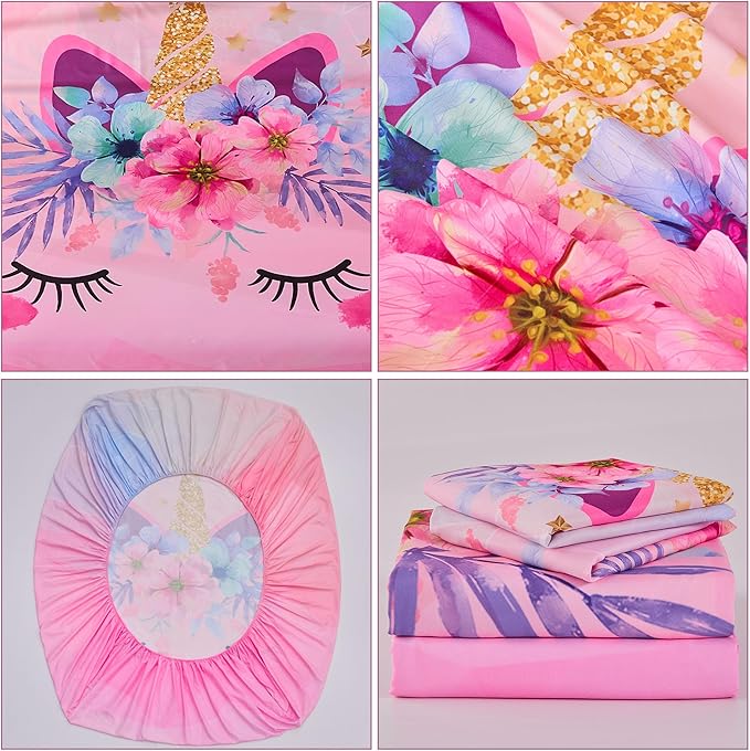 - 🦄【Design】Full Size Bed Kids Sheet Set combine unicorn and flowers in pink, create a warm and dreamy bedroom and bring more color and fun to life. Essential 3D unicorn toddler sets for bedroom decorations, you will find your kid getting a restful sleep on 3D toddler comforter sets.