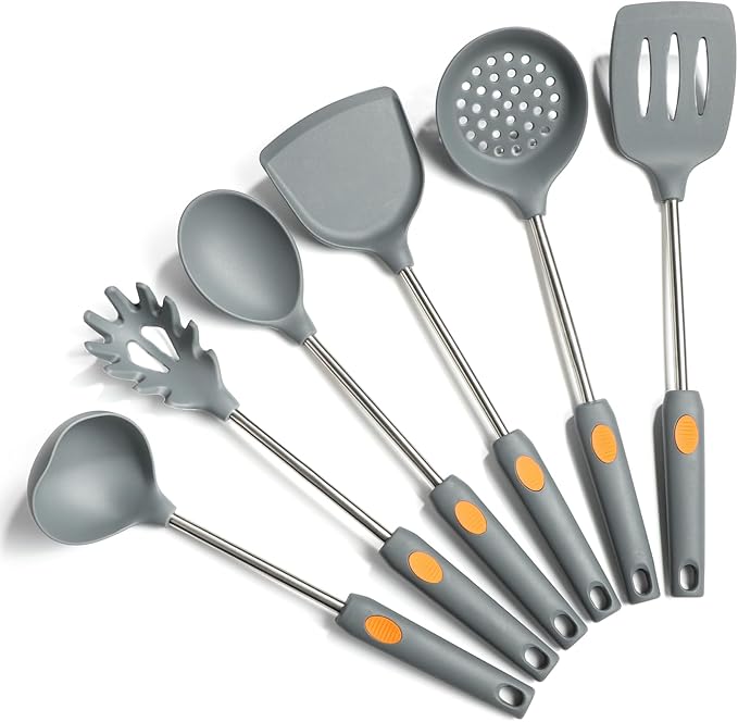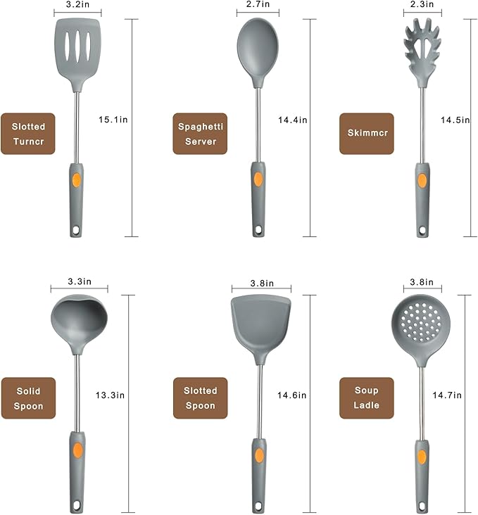 - Cooking Utensil Set: 6 Pieces basic kitchen utensils set slotted turner, a spaghetti server, a solid spoon, a slotted spoon, a mixing spoon, and a soup ladle, A practical silicone cooking utensils set meet all kinds of your daily cooking needs.