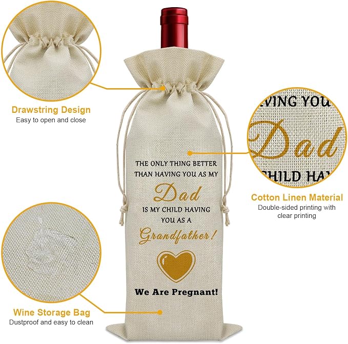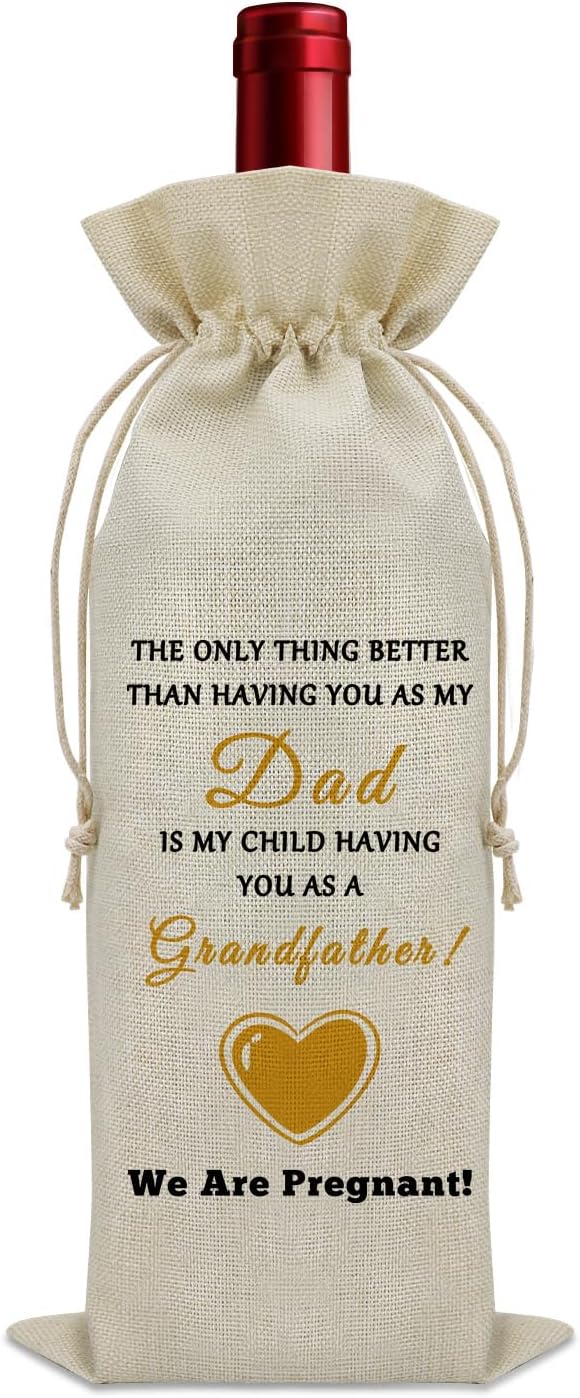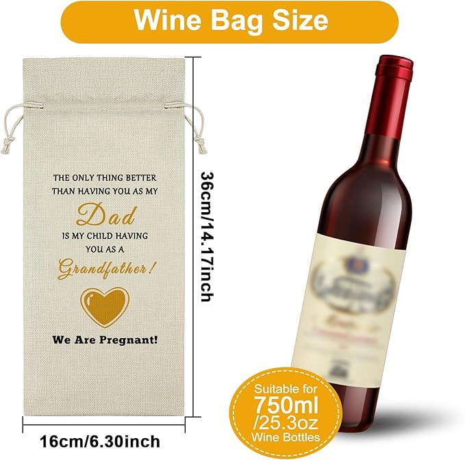 - Pregnancy Announcement Gifts for New Grandpa:This wine bag is a unique and inspiring gift for grandpa with the words "THE ONLY THING BETTER THAN HAVING YOU AS MY DAD IS MY CHILD HAVING YOU AS A GRANDFATHER! WE ARE PREGNANT! ”and hearts, tell grandpa the good news, give him a little surprise.