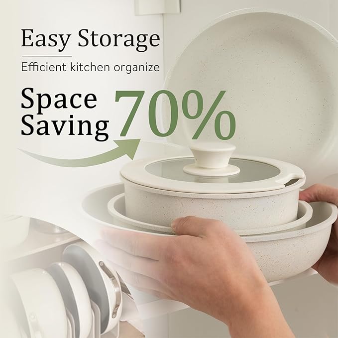 - ๐ญ๐๐ ๐ ๐ช๐๐๐๐๐๐-๐๐๐๐ ๐ช๐๐๐๐๐๐๐ : Optimal storage and easy stacking with the handles off saves up to 70% more space of Carote detachable handle pots and pans set.