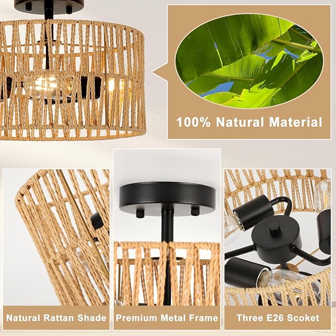 Woven Semi Flush Mount Light Fixture, 3-Light Farmhouse Rattan Light Rustic Coastal Hemp Rope Black Ceiling Light for Hallway Bedroom Kitchen Entryway Farmhouse