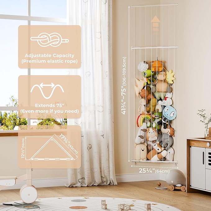 - Adjustable Large Capacity Toy Holder: This toy storage organizer with elastic ropes is adjusted in length from 41¾" to 75"(Maximum length after applying force), with a maximum capacity of 70L. It holds many stuffed animals without taking up floor space and prevents toys from falling out.