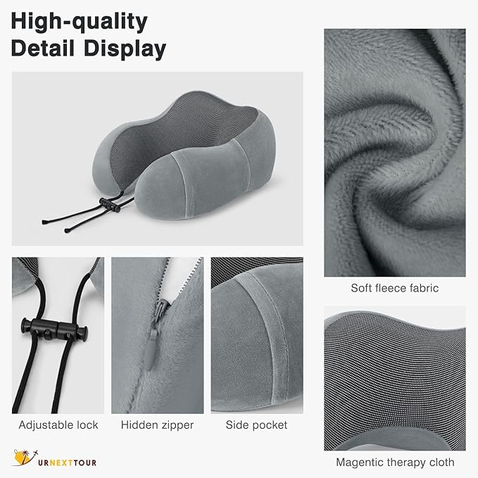 - Premium Memory Foam & Washable Cover: Urnexttour travel neck pillows for airplanes were made of superior-quality, high-density memory foam filler with 3s rebound technology. This flight pillow is covered with a comfortable and breathable magnetic therapy cloth and supper soft velour fabric; millions of tiny microbeads inside give you a very smooth feeling on your face. The cooling pillowcase has an invisible zipper that can easily be removed for washing.