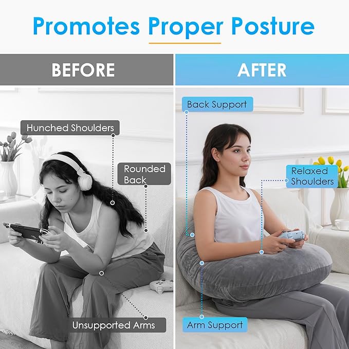 - Promotes Proper Posture: By providing optimal support for your arms and back, this pillow helps promote proper posture, reducing the risk of developing aches and pains from poor sitting habits
