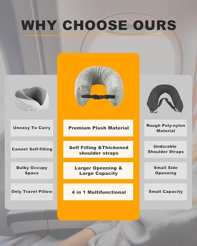 - 【Travel Essentials】 Travel smart with this unique carry-on companion that provides extra storage without baggage fees when you fly. Enjoy plush neck and lumbar support on airplanes, car road trips, trains, and even as a handy carrier on bikes and motorcycles! Travel neck pillow stuffable with clothes