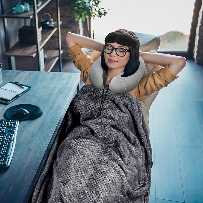 Travel Pillow and Blanket Set Neck Pillows Soft Blankets with Sleep Mask Travel Essentials for Airplane Car Memory Foam Grey