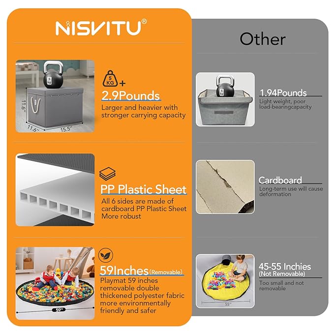 - Play Mat Removable:The toy storage box can be removable into a toy box and Play Mat for Kids. After disassembly, it can be used as two different products, which can be disassembled and connected at will. The toy storage organizer connection uses metal buckles, which are not easy to fall off and be damaged.