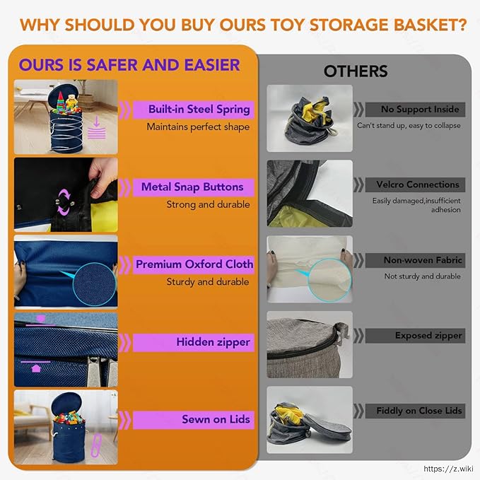 - Premium Material & Steel Spring Support - This toy storage organizer and play mat are made of high-quality thicken Oxford cloth, Polyester fabric, steel spring, and double zipper. The toy storage bin body is supported by steel springs to keep it upright and stronger, not easy to deform or collapse. Without smell and can be washed. Comfortable to touch and safe for your children and your pet. Our high-quality toy box with a soft but sturdy sorting mat is designed to stand the test of time