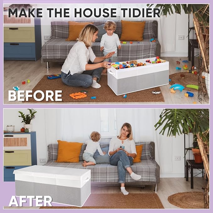 - 【Elegant Color Matching】:This extra large toy boxes adopts the contrasting design of white and light gray, which is very elegant and refreshing. It doesn't look out of place in your living room or bedroom. The color of this product is very well-matched and unified with the color of your furniture and sofa.