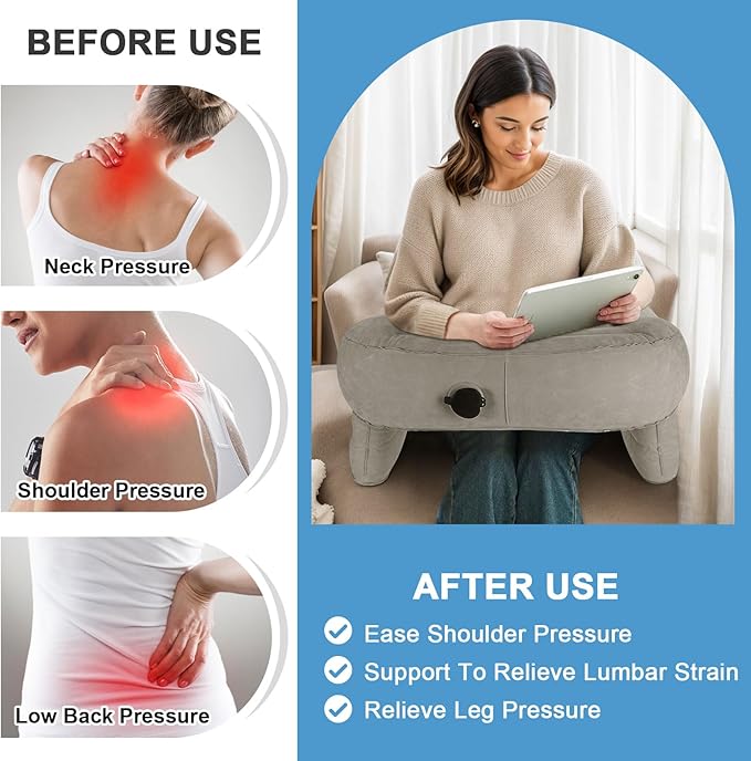 - 【Arm Rest & Eye Protection】Our inflatable lap desk offers extended armrests and a flat desktop, ensuring a comfortable working experience while reducing pressure on your arms, back, and lumbar. Plus, it maintains an optimal distance between your eyes and devices, protecting your eyesight.
