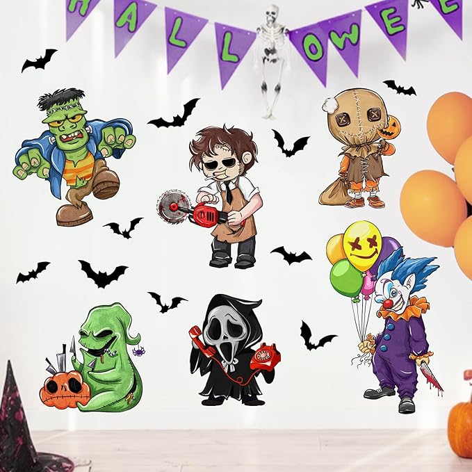 - Bedroom Decorations: Our Halloween wall decals are designed with various vivid patterns like Grim Reaper, Sam, Frankenstein, joker, chainsaw killer, green monster, bat. These horror movie merchandise wall decals and stickers are suitable for bedroom, living room, kitchen, bathroom, patio, farmhouse, retail store, restaurant, coffee house and party supplies. Perfectly DIY a scary space for your home and office