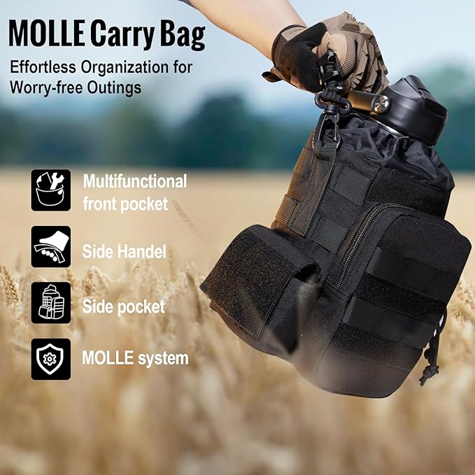 - The Complete Hydration Solution: Elevate your hydration experience with our water bottle and included accessories. From 3 different lids and 2 straws for versatile use with any beverage, to a cleaning brush for easy maintenance, we've got you covered. Plus, our tactical water bottle also comes with a spacious bag and paracord handle that can be worn crossbody or carried by hand, with extra pockets for storing small items you need for the day such as cell phones, keys, and cion or cash.
