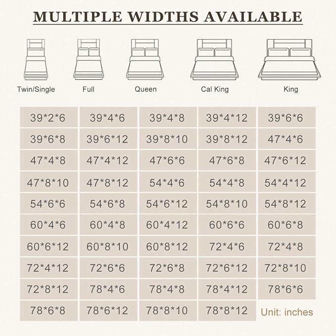 - [8 MATTRESS WIDTHS] 39", 47", 54", 60", 70", 72", 76", 78" applied in Twin/Twin XL/Full/Queen/Cal King/King Bed, also works great as a soft elongated foam pillow for other bed sizes when placed against the wall. You could also customize bed gap filler for crib beds. Product Size Error:±0.3in.