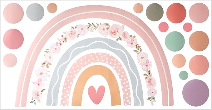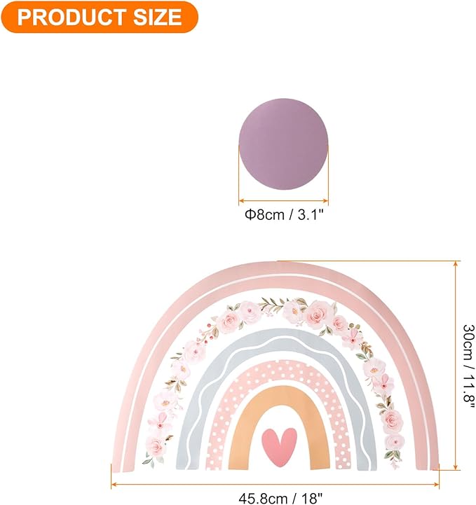 - Color: Multicolor; Material: PVC; Sticker Size: Rainbow: 45.8 x 30cm / 18 x 11.8inch(L x W), Small Dots: 3cm / 1.2inch, Medium Dots: 6.2cm / 2.4inch, Large Dots: 8cm / 3.1 inch; Packing Content: 1 Sheet x Wall Sticker ( include 18 Pcs)
