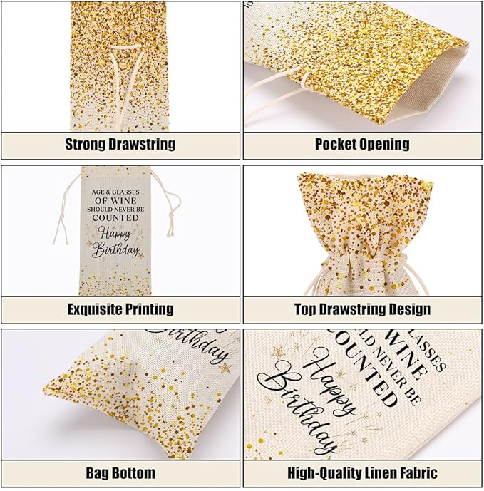 - Colorful Graphics And Text: Our wine bottle bag prints are clear and sleek with vibrant and eye-catching graphic text that adds a playful and celebratory element to any birthday party. An ideal gift for both men and women, this elegant wine bag combines beauty and functionality. Our wine bags are perfect for all kinds of important occasions, making the occasion more memorable and memorable.
