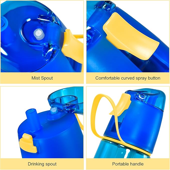 - 2-in-1 Design: - Drinking water relieves thirst, and spraying mist cools down. Its misting function keeps you moist and refreshed on scorching days, while still enabling you to drink. Just press the trigger for a full spray of water.