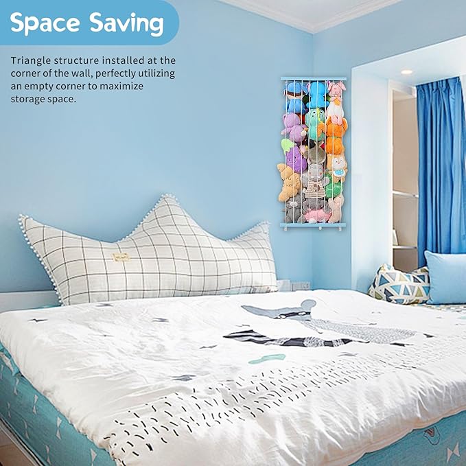 - Space Saving: Designed for use on corner wall, this stuffed animal holder will not take up extra floor space. Fan-Shaped cutting, can make full use of the corner position, which will save a lot space for you. Great hanging toy organizer for kids playroom bedroom.
