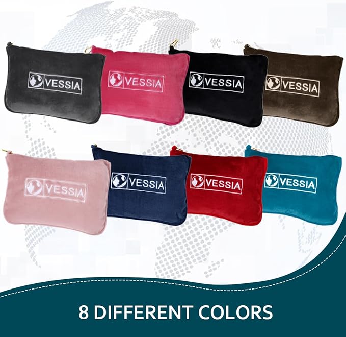 - PERFECT TRAVEl ASSISTANT - This warm compact Vessia Travel Blanket and Pillow 2 in 1 would be a top choice for your trip. It could be used on the Airplane, train, couch and car. This portable blanket would keep you warm and comfort. Not comfortable on the Seat? You could also use this blanket as a pillow. This Travel blanket could be used in All Seasons.