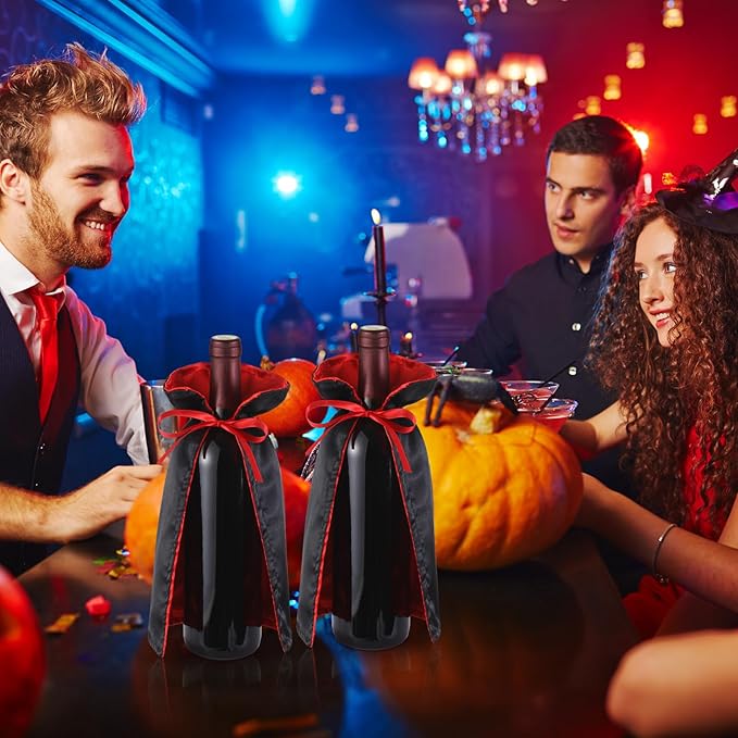- CUTE DESIGN: A Halloween wine bottle costume with a design inspired by vampires. The collar of the vampire cloak features 2 ribbons, each approximately 6 inches in length.