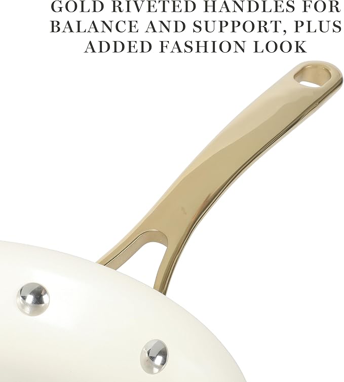- RIVETED GOLD HANDLES: Gold-colored handles lend a strikingly regal accent to any kitchen. Stainless steel rivets attach the handles securely for a sturdy and confident grip.