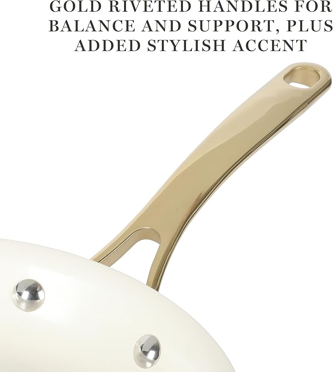 - RIVETED GOLD HANDLES: Gold-colored handles lend a strikingly regal accent to any kitchen. Stainless steel rivets attach the handles securely for a sturdy and confident grip.