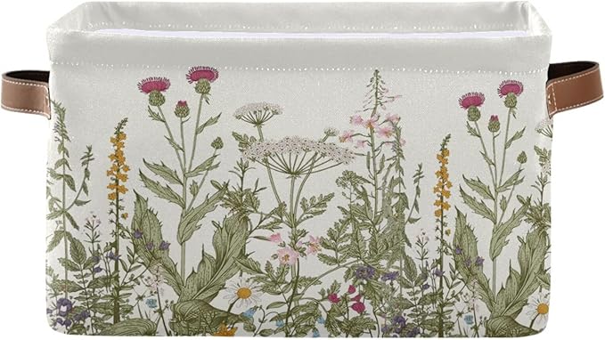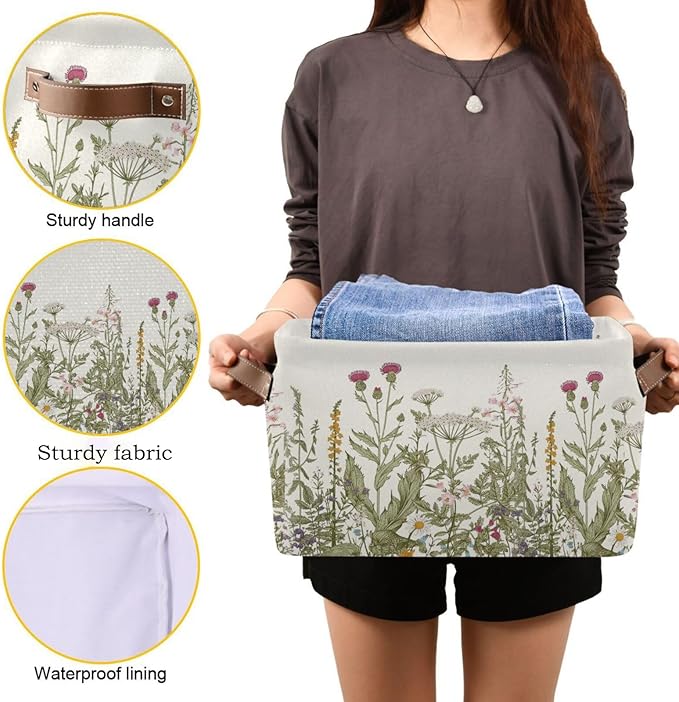 Wildflower Herbs Storage Basket Bin for Shelves Closet Botanical Foldable Fabric Storage Box Cube with Handles Kids Gifts Toys Cloth Shelf Basket Organizer for Bedroom Nursery Home Decorative