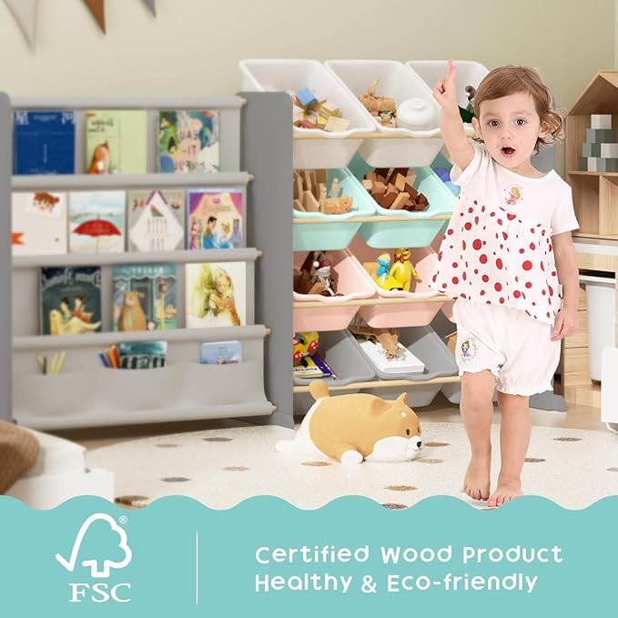 - Large Storage Space: The 12 toy bins and 4 shelves of this toy storage with kids bookshelf provide a large capacity storage area , which eliminates the need for children to rummage through boxes in order to locate their toys. This toy organizer is an ideal solution for storing books and toys for play room, nursery, or kids room.