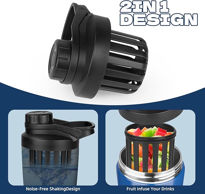 - [INNOVATIVE UPGRADED NOISE-FREE SHAKING DESIGN]:The UPGRADED noise-free shaking design, compared to the traditional old-fashioned shaker ball, our integrated removable agitator won't rattle and make a mess when you're mixing your supplements.You can also add small pieces of fruit to the adapter to create your favorite flavor.