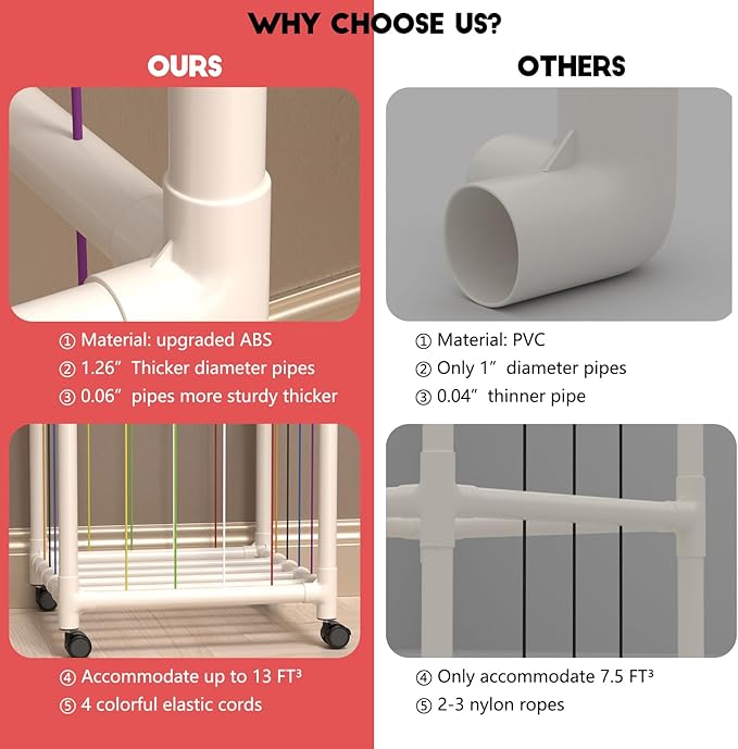 - Easy to Assemble:it installs using pipes and connectors without any screws, nuts or bolts. Upgraded colorful elastic cord,The bungee cords come pre threaded for easy assembly!If you encounter any problems during the installation process, please feel free to contact us through Amazon and we will always be here for you.