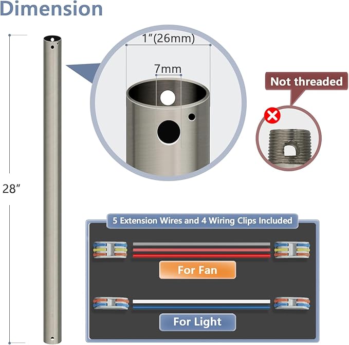 28" Ceiling Fan Downrod, 【1 Outside Diameter】 Brushed Nickel Extended Downrod, including 4 Wire Connectors and 5 Extension Wires (No Threads)