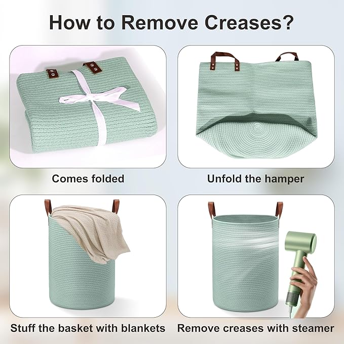 - Note: Laundry basket rope comes in a folded package and will have creases. You can use an iron to adjust the shape, or fill the rope blanket basket with blankets, clothes and wait for 1-2 days, which can help the rope basket to regain its shape