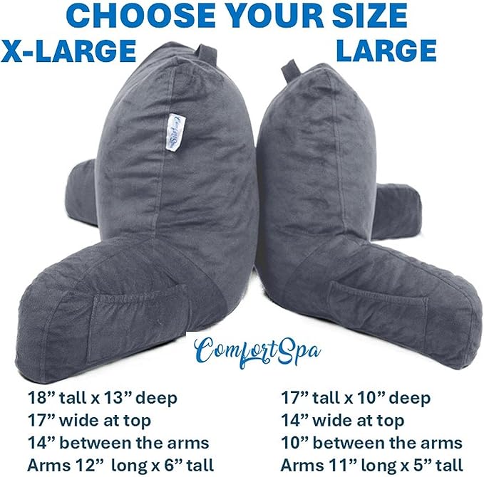 - DELUXE READING PILLOW – ComfortSpa reading pillows are made of shredded foam that conform perfectly to all body types for optimum alignment while relaxing upright. Featuring BONUS storage located in the arms side pockets for your phone, glasses, book, tablet, or remote. This standard sized pillow measures 18 inches high by 14 inches wide, providing firm ample back support. Each arm extends out 11 inches to support your shoulders and neck, reducing stress on joints and muscles for optimum healthy comfort.