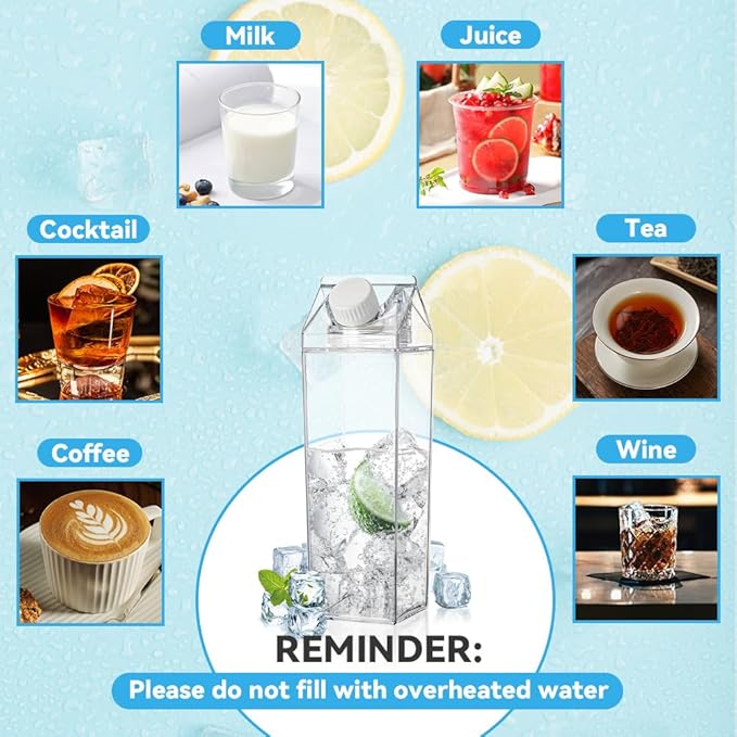 - Package Content: 2 pieces of clear milk carton water bottles in the package, coming in transparent style, well matching with different colors of drinks, abundant quantity to use, replace and share with families or friends