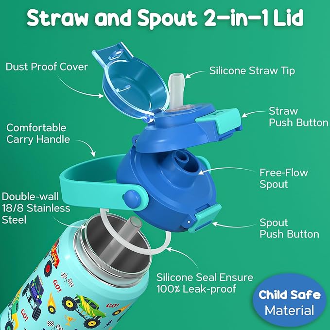 - 3-in-1 Lid & Kid-Friendly: Equipped with a dual-use & push-button lid for toddler cup, kids can sip through a silicone straw and enjoy a fast-flow chug by easily switch the two button, makes it easy for your child to use independently. Straw cup can prevent kids from choking or water pollution, direct chug cup help kids drinking quickly. If your kid is thirsty, just take off lid, drink freely from the wide mouth.The artful kids water bottle is an ideal choice for school and kid's outdoor sports!