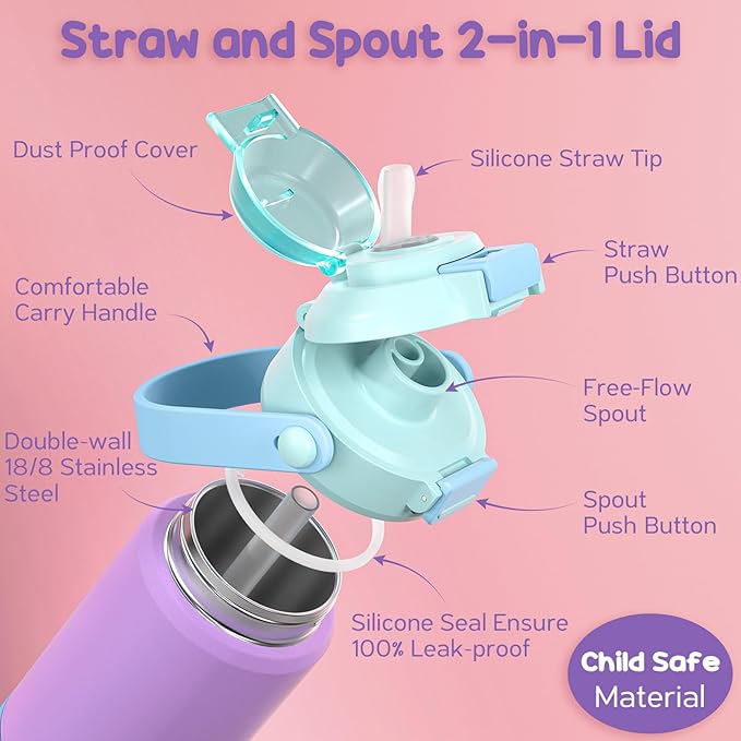 - 3-in-1 Lid & Kid-Friendly: Equipped with a dual-use & push-button lid for toddler cup, kids can sip through a silicone straw and enjoy a fast-flow chug by easily switch the two button, makes it easy for your child to use independently. Straw cup can prevent kids from choking or water pollution, direct chug cup help kids drinking quickly. If your kid is thirsty, just take off lid, drink freely from the wide mouth.The artful kids water bottle is an ideal choice for school and kid's outdoor sports!