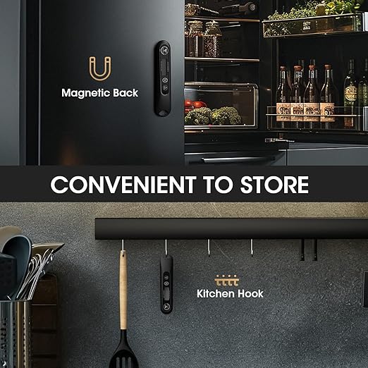 - Easy to Storage & Excellent Servies: With built-in magnets and a large hanging hole, storing the thermometer on your refrigerator or oven or a hook is a breeze.You'll get 1X meat thermometers, 1 X AAA battery, 1 X temperature guideline, 1 X user manual. Any issues, please contact us without any hesitation, we will be more than happy to help you